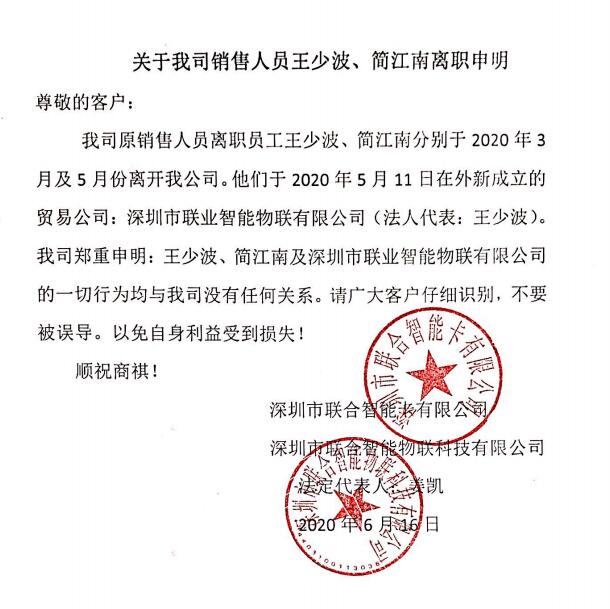 我司鄭重申明:王少波、簡(jiǎn)江南及深圳市聯業智能物聯有限公司的一切行爲均與我司沒有任何關(guān)系!